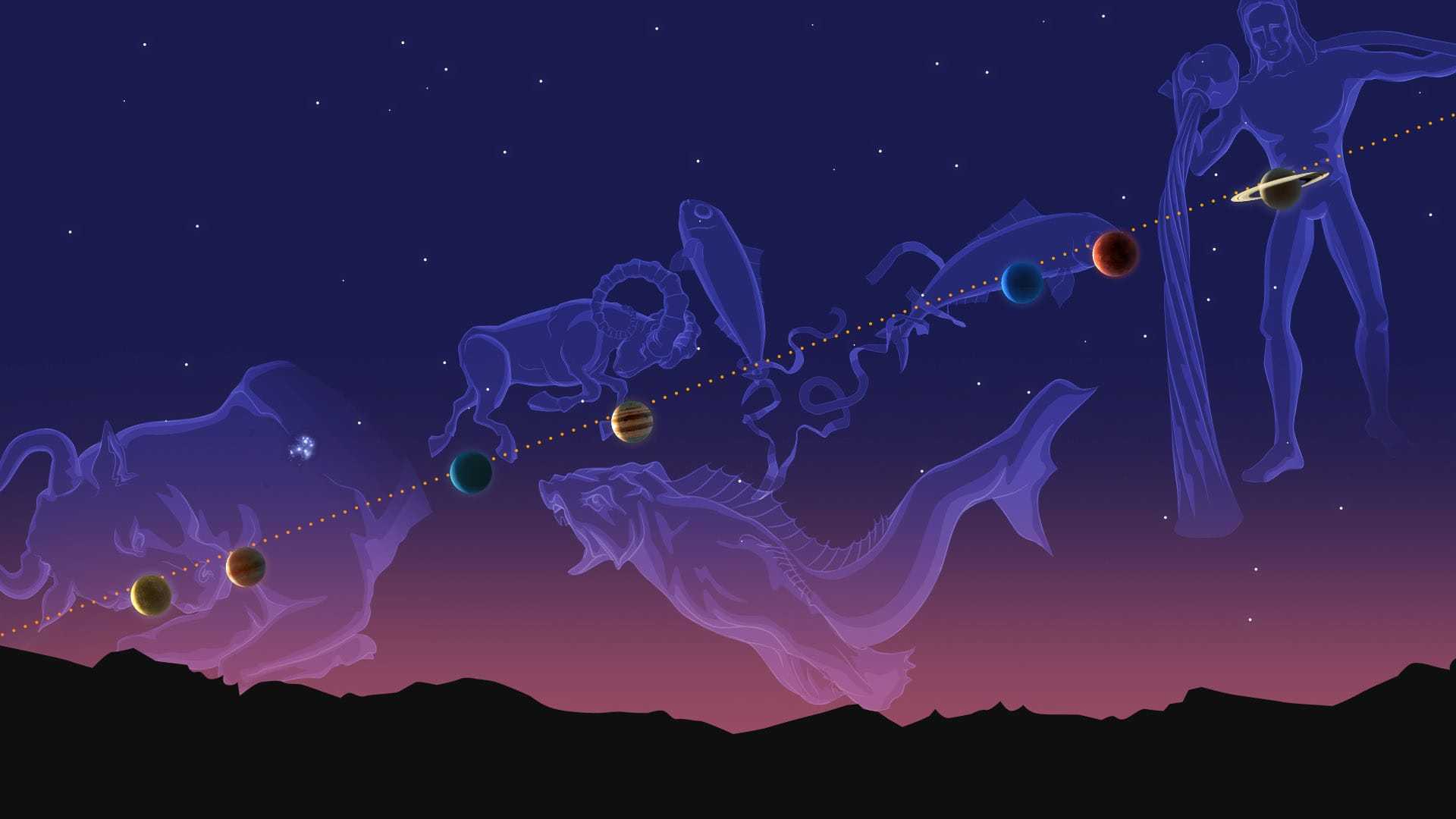 Планеты выстраиваются в линию, хотя и не абсолютно прямую. Все планеты вращаются вокруг Солнца примерно в одной плоскости. В результате, с Земли кажется, что планеты движутся вдоль эклиптики, видимого годового пути Солнца по небесной сфере. Вы можете убедиться в этом сами с помощью астрономического приложения Sky Tonight: