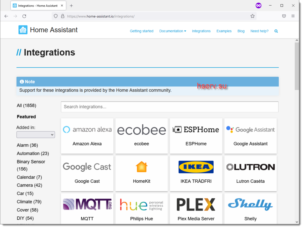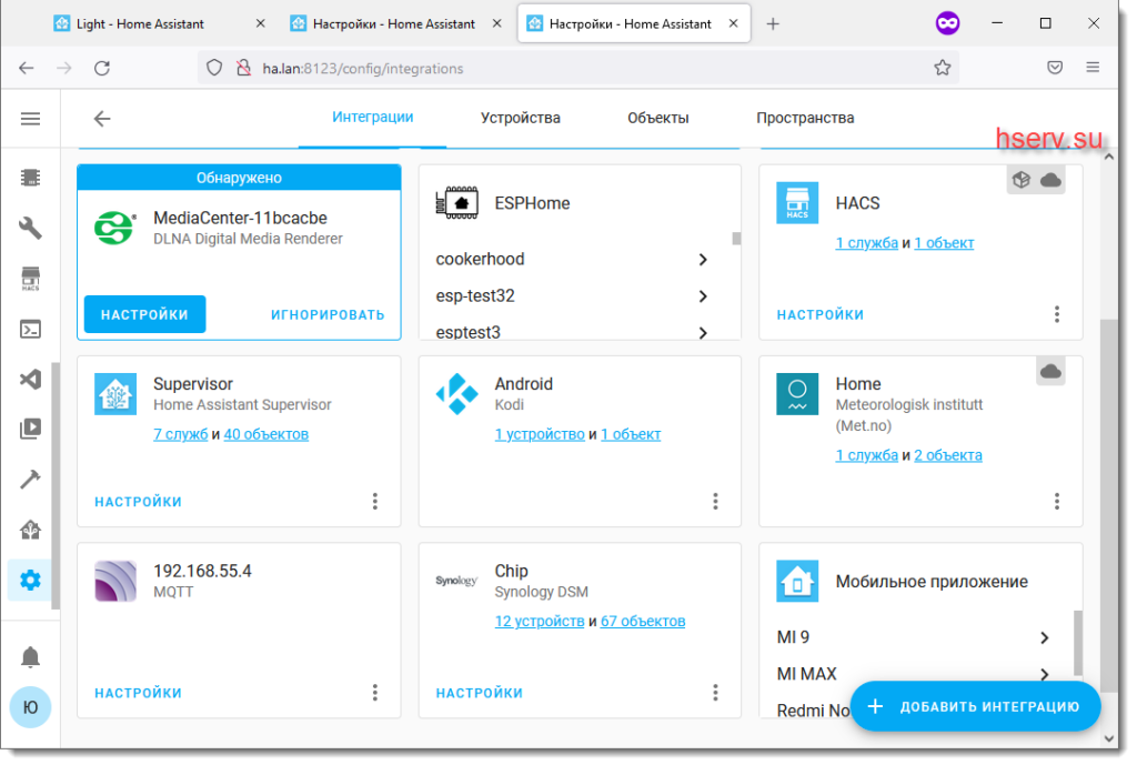 Здесь представлены некоторые интеграции, которые используются у меня. Все возможные интеграции можно найти на сайте Home Assistant