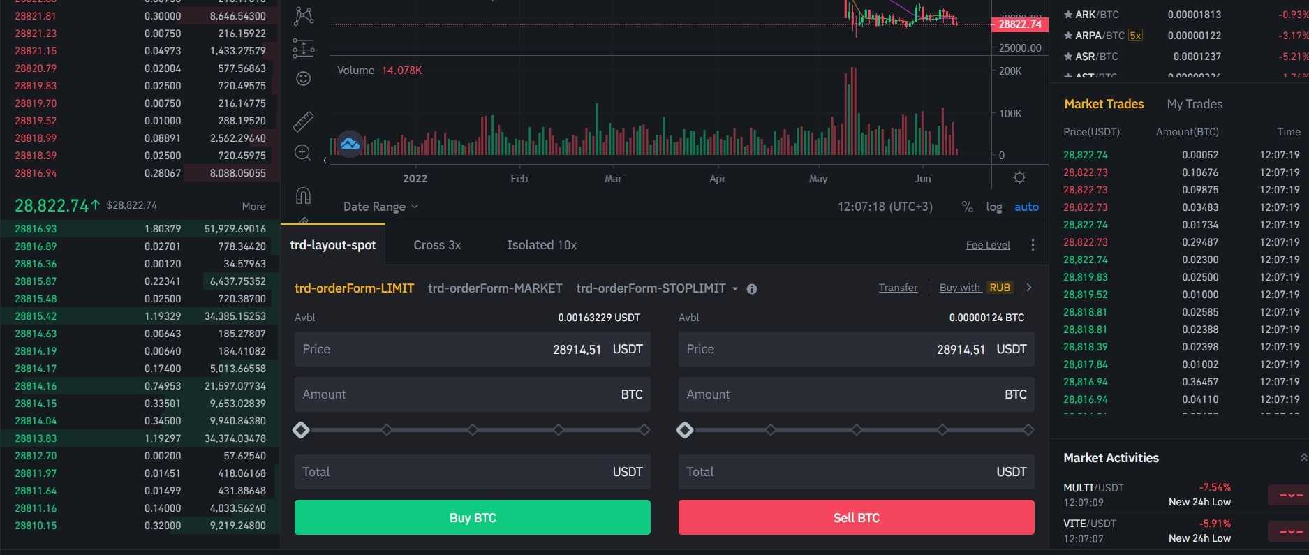 Данный тип ордера состоит из лимитного ордера и стоп-триггера. После достижения триггерной цены отдается приказ на совершение сделки. Ордер с функцией Stop-Limit можно оформить в любом терминале Бинанс.