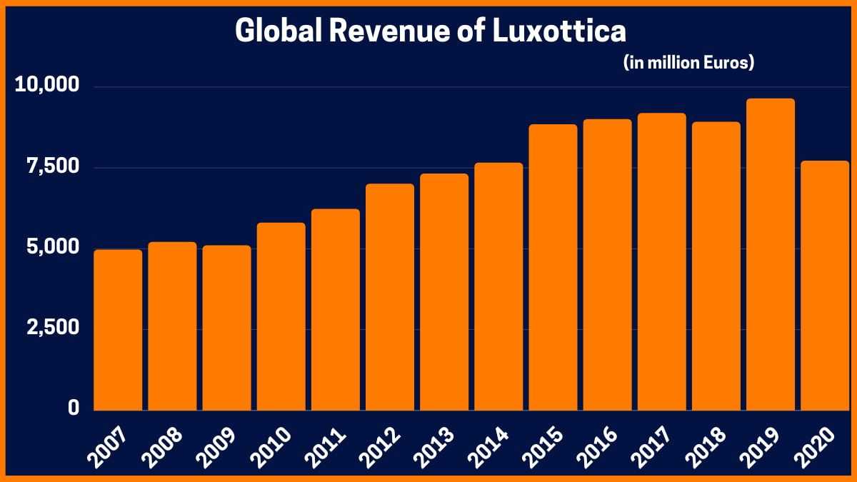 The above image shows Global revenue of Luxottica, starting from 2007 to 2020. The figures stated are in million euros. This graph is quite evident of the hold that the company has in this product segment.