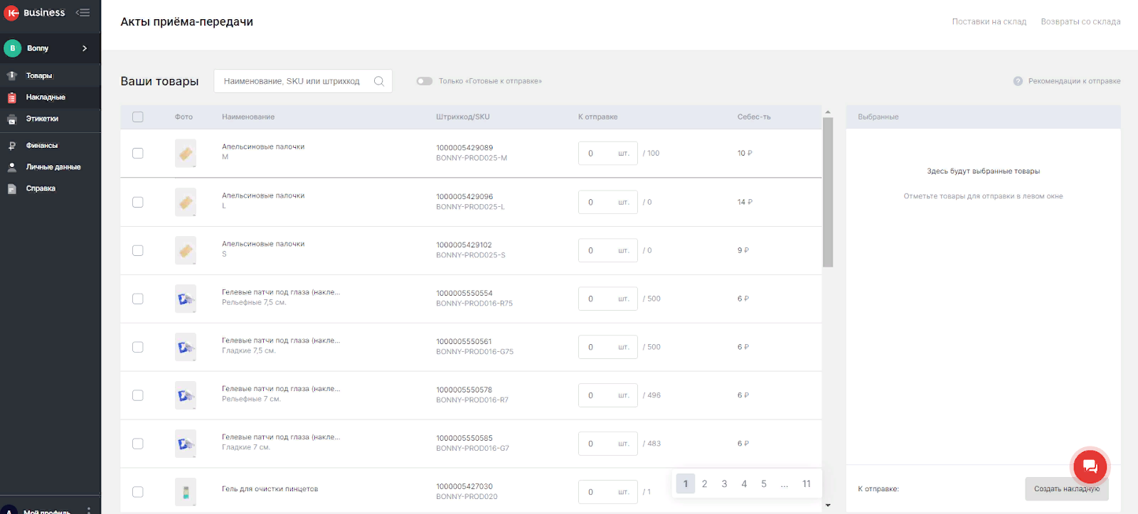Перед отправкой товара сформируйте акт приёма-передачи в разделе «Накладные». Внесите перечень товаров с номерами штрихкодов, названием и количеством.