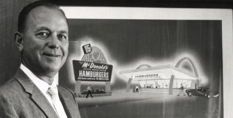 Рэй Крок, уроженец Чикаго, бросил школу после второго года обучения, чтобы присоединиться к корпусу скорой помощи Красного Креста во время Первой мировой войны. Рэй вернулся домой, чтобы работать музыкантом, а позже продавал бумажные стаканчики после окончания войны, прежде чем его подразделение было отправлено за границу. В 1939 году он стал эксклюзивным дистрибьютором Multimixer (машина для смешивания молочных коктейлей). В 1954 году он нанес визит братьям Макдональдам, в результате чего стал их франчайзинговым агентом. Крок открыл первый McDonald’s к востоку от реки Миссисипи в 1955 году.