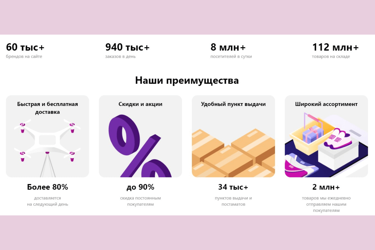 - Упор на своевременную доставку — наличие огромного комплекса ПВЗ, развитой логистики, примерочных. Заказы отправляются своими силами — например, на долю «Почты России» приходится не более 1 % отправлений.