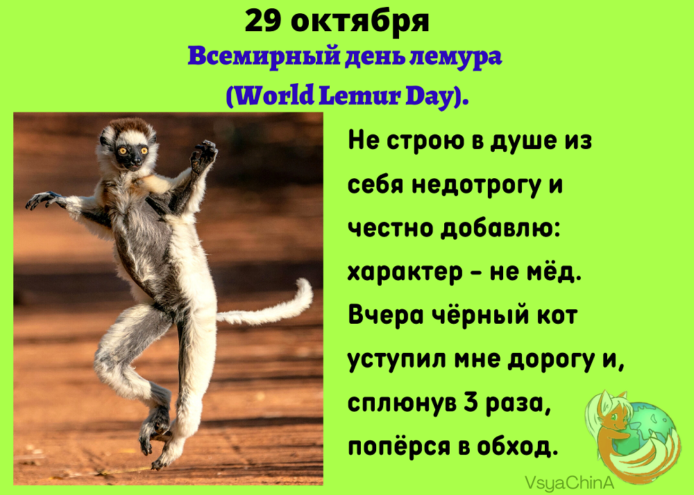 Самое масштабное мероприятие этого необычного праздника происходит на Мадагаскаре. Фестиваль посвящён защите милейших созданий — лемуров. И не удивительно, так как 95% из более 100 видов лемуров находятся под угрозой вымирания.