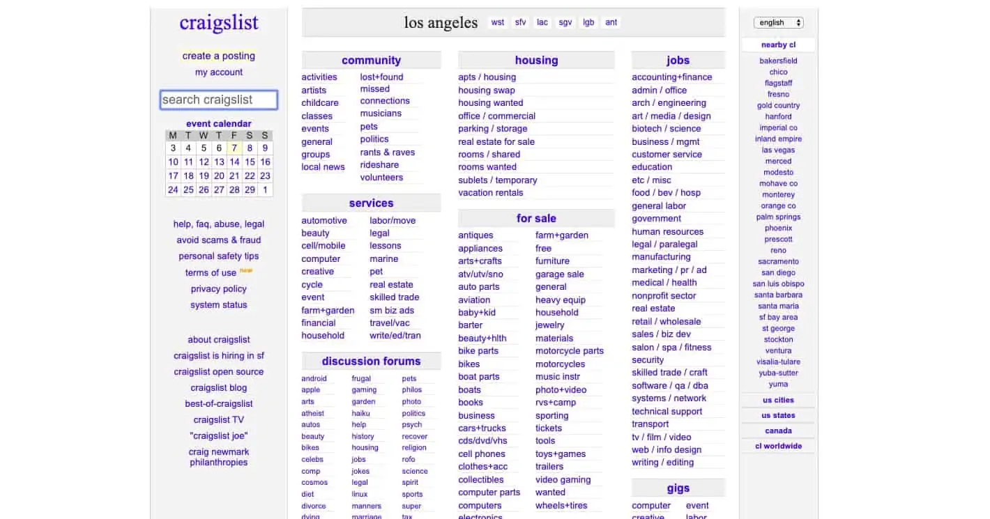 Покупайте все, что вам нравится, продавайте вещи, которыми вы владеете, ищите конкретный товар или размещайте рекламу своего продукта или бизнеса. Бесплатные объявления помогают со всеми вышеуказанными действиями бесплатно. Этот сайт в основном предназначен для населения США, следовательно, он помогает вам просматривать или искать рекламу по всей стране. Он имеет сотни категорий для выбора или показа ваших объявлений, поэтому вы можете искать или размещать рекламу практически для любого продукта, о котором вы только можете подумать. От транспортных средств, недвижимости и услуг до рабочих мест есть что исследовать.