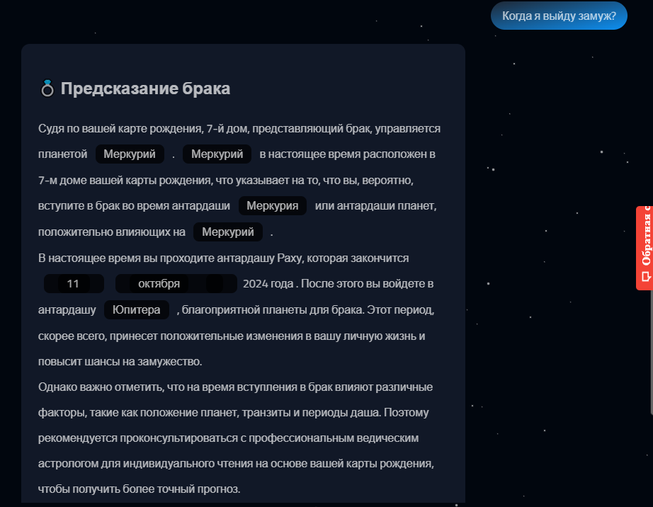 AstroGPT предсказал, в какой год автору статьи лучше выходить замуж. Основывался он на данных из Google-аккаунта, то есть имени и дате рождения