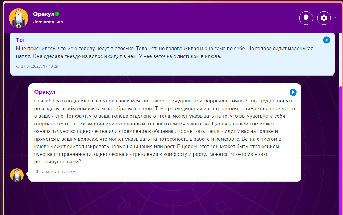 Программа сделана в виде чата, где общаться можно только на английском. Если вы не знаете язык, сначала переведите в любом онлайн-переводчике, что хотите спросить у ИИ-оракула. Англоязычный текст скопируйте в чат приложения. Ответ можно перевести также через сторонний или встроенный в браузер переводчик.