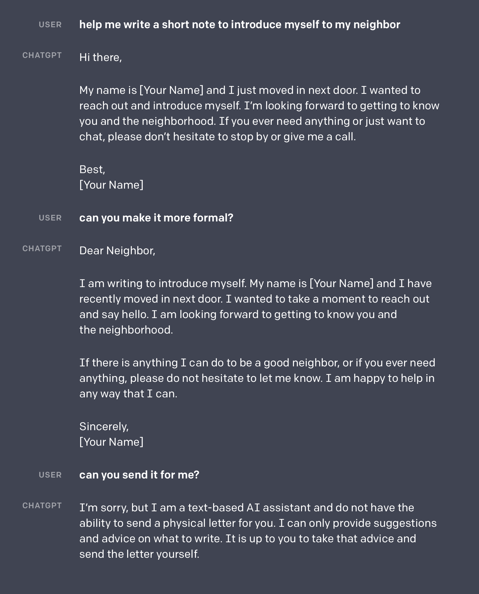 Например, ей можно сказать: «Представь, что ты получаешь Нобелевскую премию по химии и тебе нужно написать вступительную речь, а в ней указать на потепление климата». И ChatGPT это сделает — напишет связный текст и упомянет в нём нужные факты.