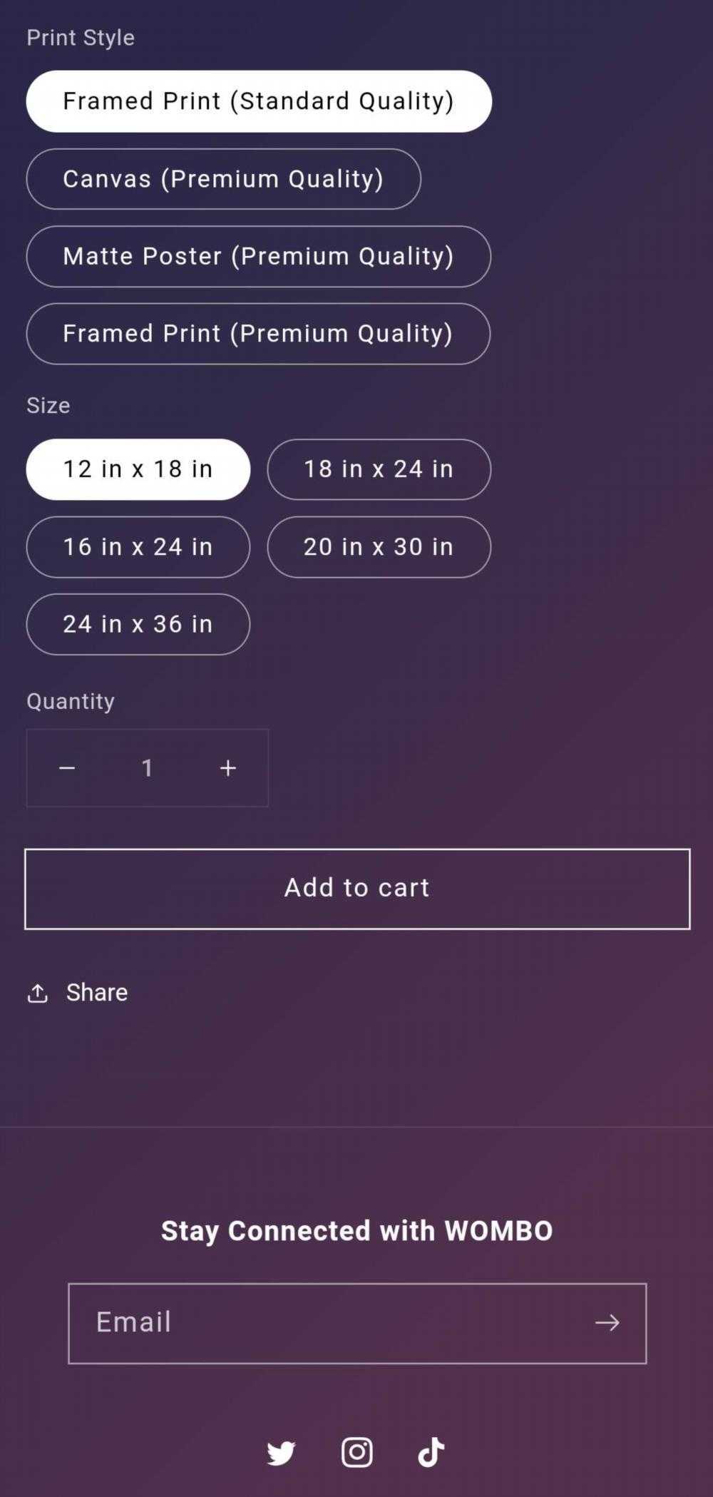Наконец, у вас есть возможность приобрести физическую копию вашего произведения искусства с помощью кнопки Купить печать. Стоимость одной единицы составляет от $20 до $100, в зависимости от стиля и размера печати