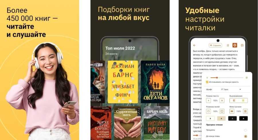 Сервис позволяет читать книги и журналы, слушать аудиокниги и подкасты. Особенно подкупают разные тематические подборки, возможность отложить книги в избранное и сохранять понравившиеся цитаты. Также есть детский режим, который оградит ребенка от нежелательного контента, если приложение установлено у него на устройстве.