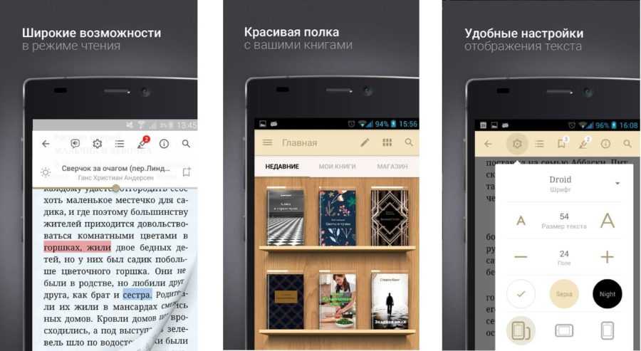 | Поддерживаемые форматы: | FB2 (в том числе и в архиве FB2.ZIP), ePub (включая поддержку ePub3 с видео и аудио), PDF, DJVU, MOBI, документы Microsoft Office (Doc, RTF), а еще – TXT, HTML и TTS (воспроизведение текста вслух) |