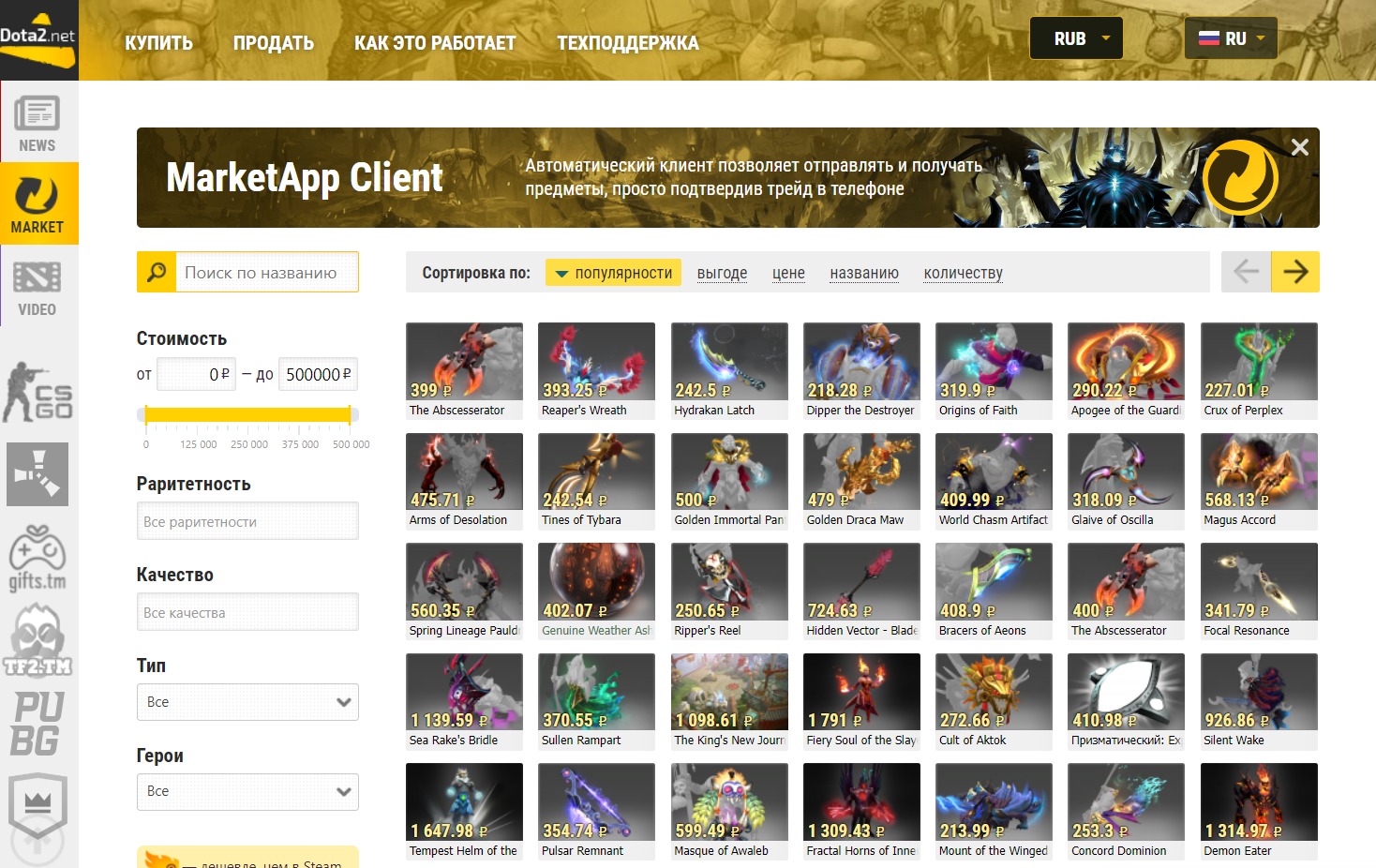 - Для продажи игровых предметов из Dota 2, можно воспользоваться сайтом — https://market.dota2.net/;