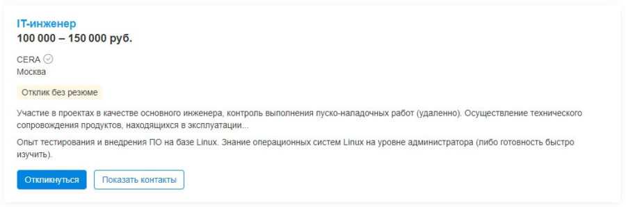 С опытом от 2-3 лет заработная плата специалистов вырастает в несколько раз: IT-инженерам, знакомым с Docker, nginx, Apache, Git, MySQL/PostgreSQL платят уже от 100 000 рублей в Москве и от 80 000 рублей в регионах.