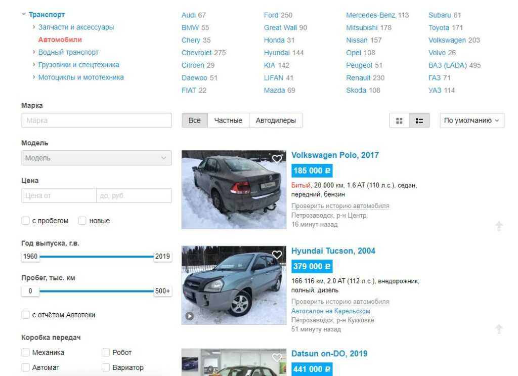 Популярный сайт объявлений, который содержит информацию о новых и подержанных авто от частных и юридических продавцов. К основным достоинствам Авито относят удобную систему фильтрации — можно ввести подробные данные о модели, годе выпуска, стоимости и пр. Объявления размещаются бесплатно и показываются на протяжении месяца, после чего их нужно давать повторно.