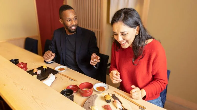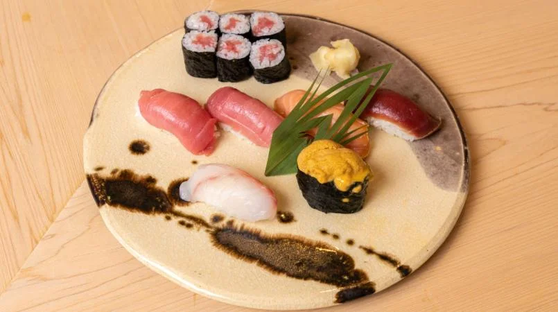 Kenji Oana, an experienced sushi chef who used to work at Sushi Sho in Yotsuya, now has his own restaurant in Ebisu. He selects ingredients himself from Toyosu Market, creates a menu with classic nigiri and seafood dishes, and matches each fish with a unique blend of two rice vinegars. The dishes have colorful garnishes, and the restaurant offers around a dozen types of sake that complement the seafood dishes.