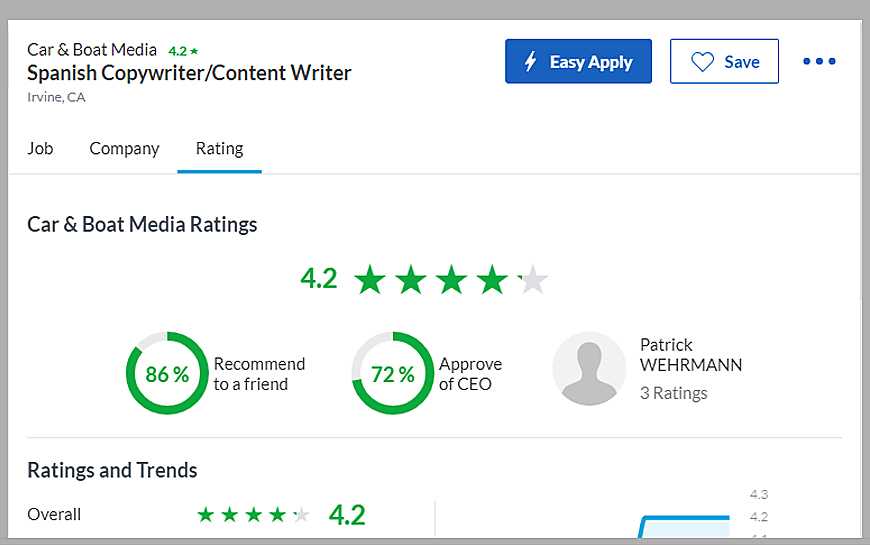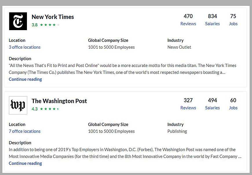 Отзывы о компаниях публикуются в специальном разделе Company reviews. Для примера мы выбрали должность «Журналист» и не указали локацию. На момент написания статьи по этим исходным критериям сервис предоставляет информацию о 103 компаниях мира, где ждут специалиста. Среди них оказались New York Times и The Washington Post.