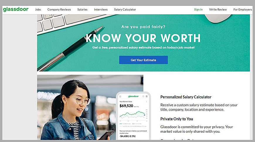 Одна из самых интересных опций на сервисе – калькулятор заработной платы. Это бесплатная оценка профессиональной квалификации соискателя на основе данных о миллионах реальных зарплат.