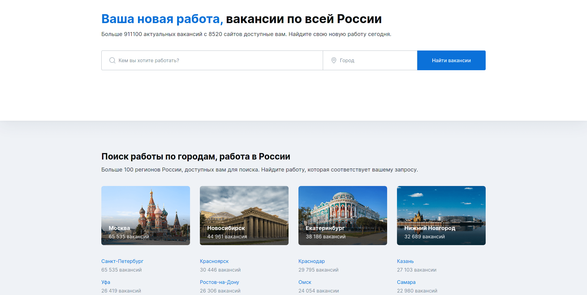 На своей главной странице портал сообщает: «Superjob — это лучшие предложения высокооплачиваемой работы от российских и зарубежных компаний». Сайт автоматически определяет ваше местоположение и, исходя из гео, выдает свежие и популярные вакансии. Действует удобный расширенный поиск по названию профессии и городу. «СуперДжоб» смог создать удобный готовый «Зарплатомер» — тест системы, который позволит определить, сколько стоят ваши профессиональные навыки. Из других ресурсов Интернет-площадки — производственный календарь, статьи для работодателей, партнеров и соискателей, предложения о стажировке для студентов.