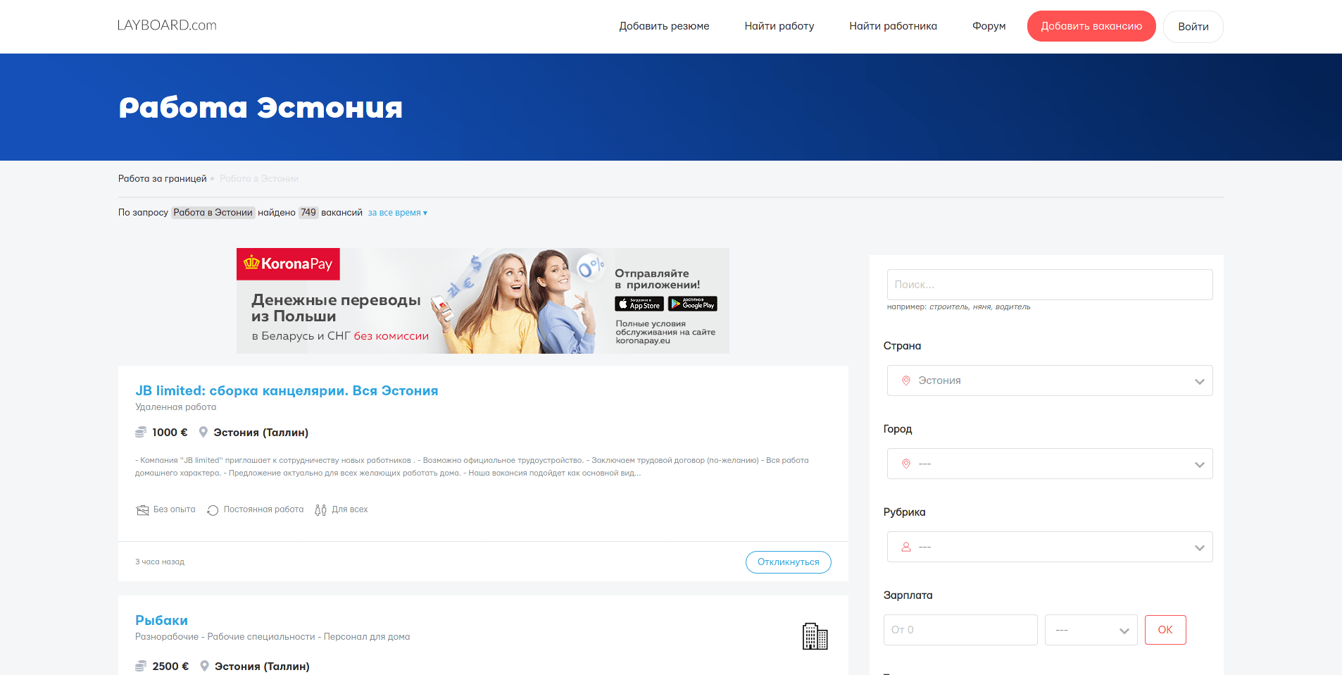1. Layboard.com – ресурс со множеством вакансий по всему миру. Главной его особенностью является удобные фильтры для поиска. Достаточно ввести место предполагаемой работы и название должности. Есть вариант поиска по отраслям. Для удобства соискателя удастся просмотреть и количество актуальных предложений. Layboard работает по всему миру, что также удобно для мигрантов из разных уголков планеты.>