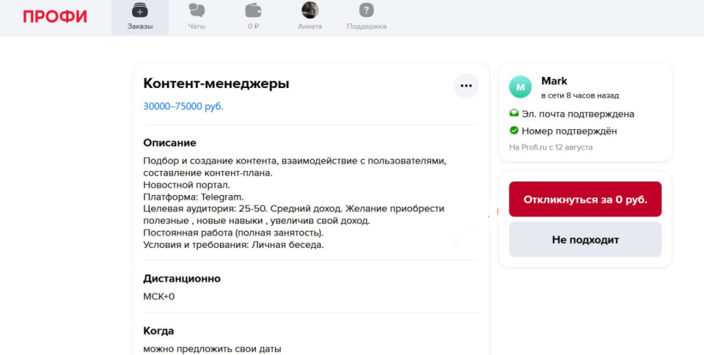 Сервис с большим количеством специалистов и предложений по работе как сдельного характера, так и на постоянной основе. Основной костяк заданий связан не с интернет-услугами, а с оффлайн-работой. Здесь ищут массажисты, слесари, репетиторы. Соответственно, и маркетологи требуется по большей части не для интернет-продвижения. Но все-таки на удаленку людей тоже ищут, вот пример такой вакансии: