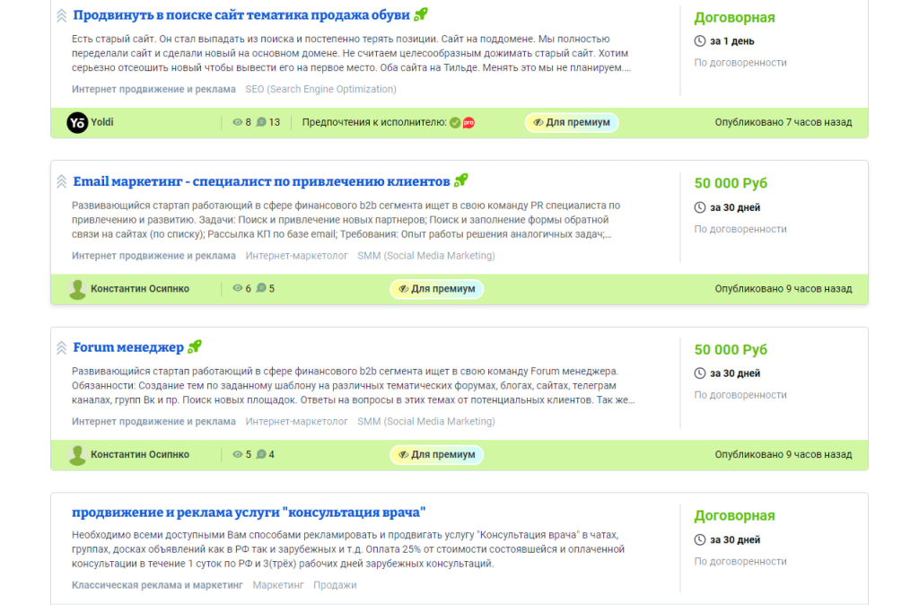 Классическая фриланс-биржа наподобие Fl.ru или Weblancer. При этом здесь маркетинг выделен в две категории — классический и в интернете. Заданий в этом направлении много, и они регулярно обновляются.