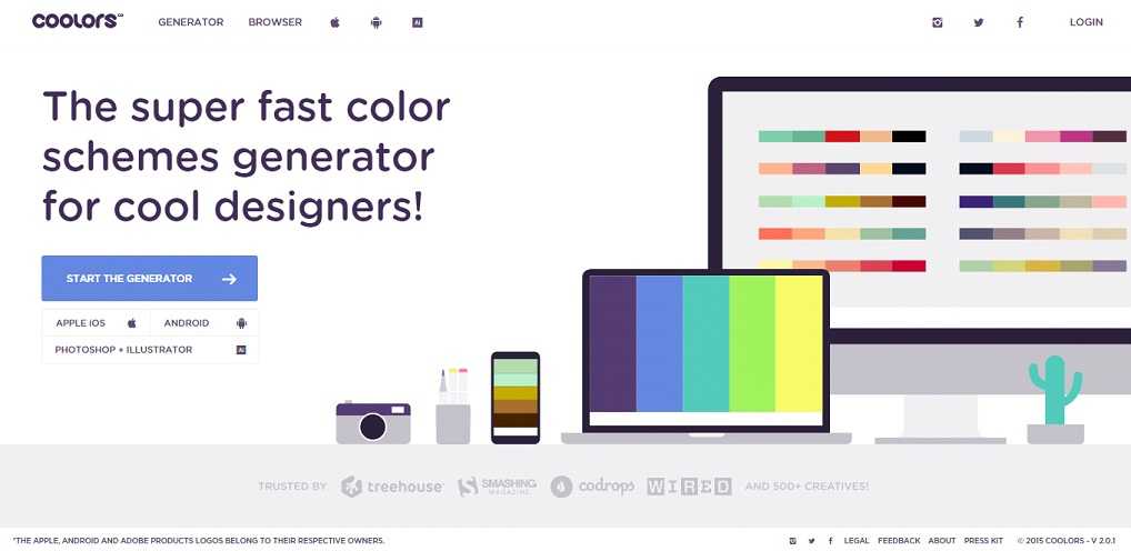 Coolors – Просто процитируем слова с главной страницы сайта: “Супер быстрый генератор цветовых схем для крутых дизайнеров”.