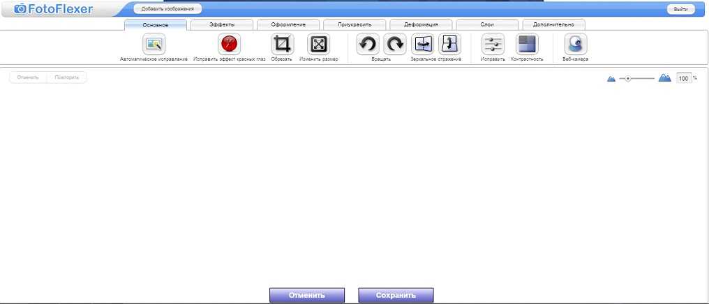 Fotoflexer – еще один онлайн фото редактор со множеством различных эфектов. Поддерживает множество популярных фотохостингов, но есть один существенный минус – не поддерживает кирилицу.