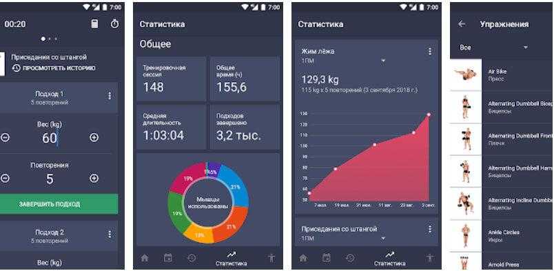 Функционал приложения впечатляет: калькулятор повторного максимума, графики прогрессии, история тренировок. После каждого подхода можно оценить его сложность. Пропущенную тренировку можно перенести.