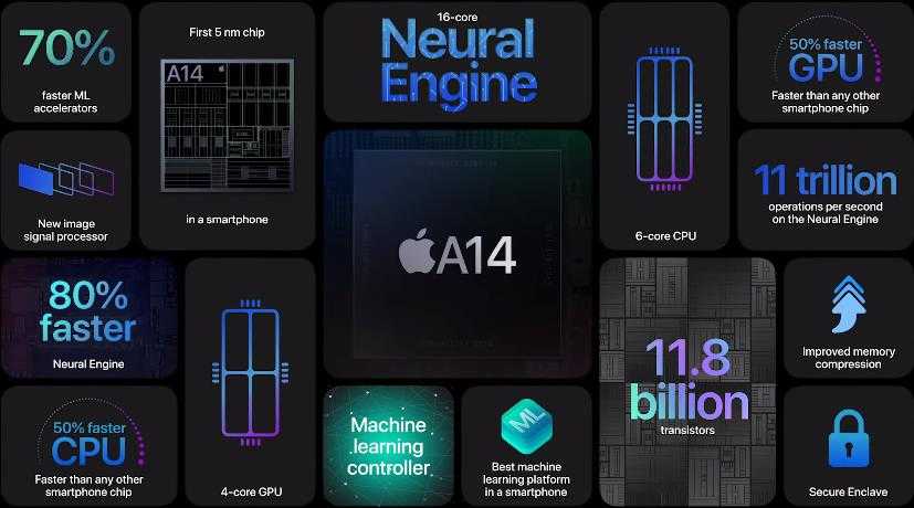 Уменьшение размера транзистора позволяет добавить функции и повысить производительность, в то же время улучшая энергоэффективность. Команда разработчиков поместила 11,8 миллиардов транзисторов в A14 Bionic, что почти на 40% больше, чем в A13.