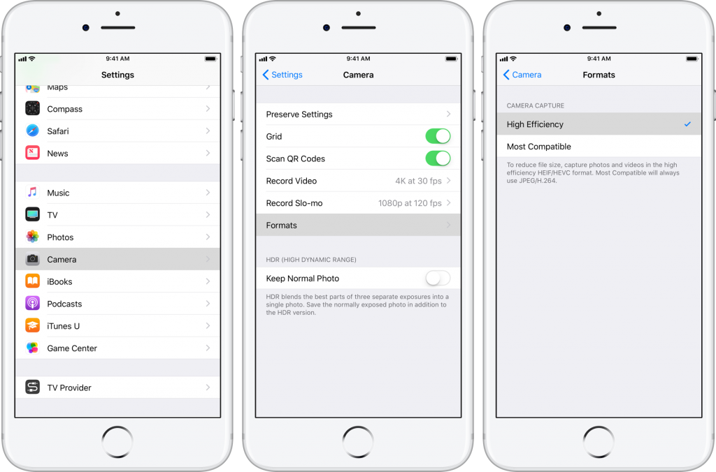 To switch between H.264 and H.265 media capture, go to Settings → Camera → Formats and select either the “Most Compatible” (H.264) or “High Efficiency” (H.265) option.