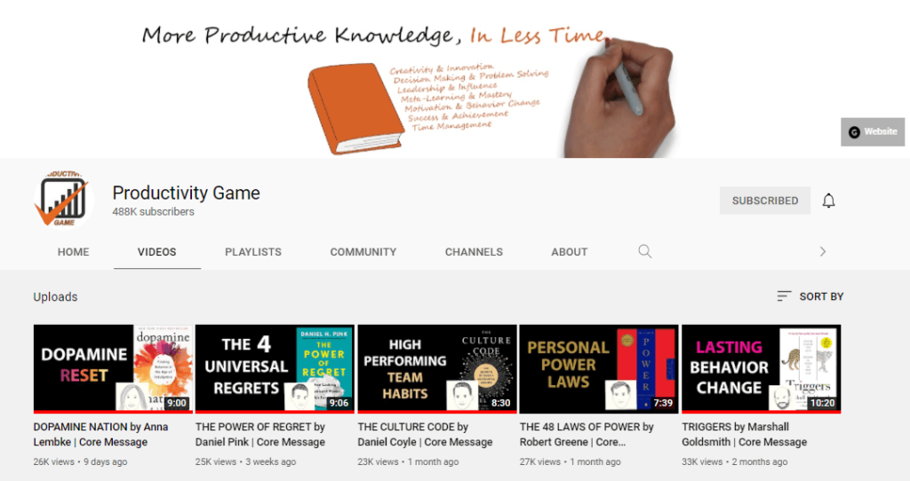 A great example of a book review channel that I actually follow is Productivity Game which has over 480,000 subscribers and gains around 7,000 subscribers a month.