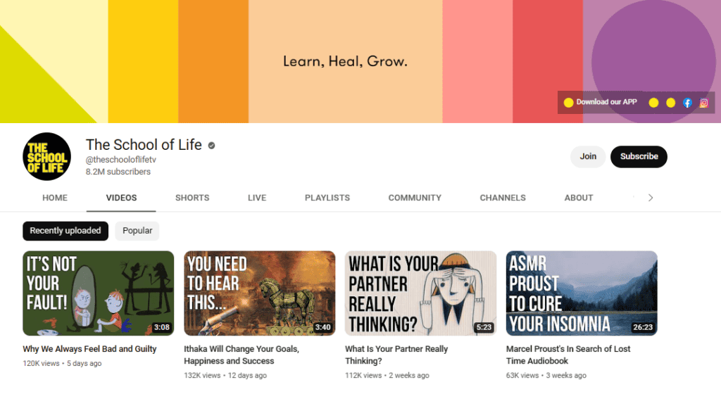 The School of Life is a popular YouTube channel that covers a wide range of topics related to mental health and self-care, including psychology, philosophy, and personal growth.