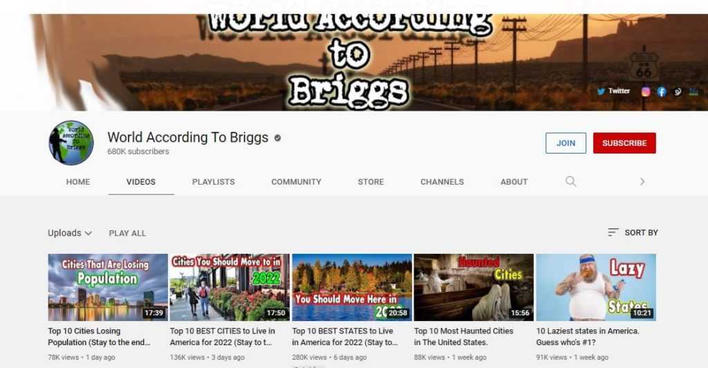 An example channel is the World According to Briggs, and on this channel, he talks about facts about different places, mainly in the United States, like the top 10 most hated states in the US or the top 10 cheapest states for renters.