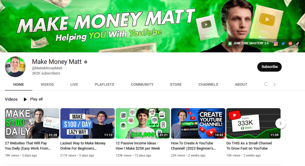 An example channel is Make Money Matt which is the creator of Tube Mastery and Monetization 3.0 – one of the best YouTube automation courses.