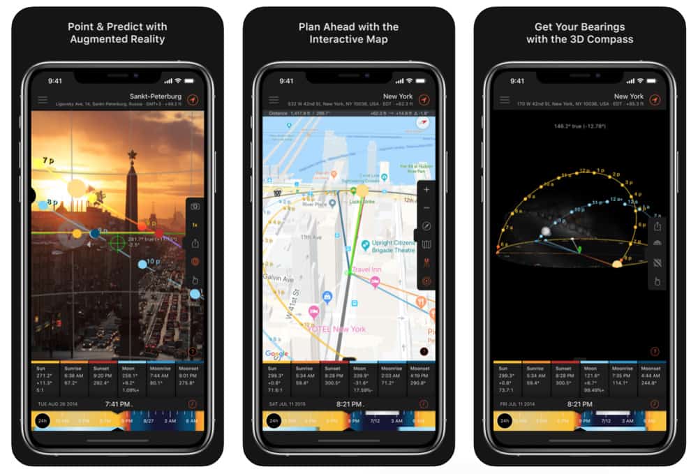 - Официальное описание приложения: Sun Surveyor раскрывает тайну восхода, заката и фаз луны, позволяя фотографам и кинематографистам находить лучшие места, эффективно планировать и делать идеальные снимки. Просмотр с камеры в реальном времени, интерактивная карта (с просмотром улиц), 3D-компас и подробные эфемериды предоставляют обширную информацию о самом большом источнике естественного света в галактике, а также о Луне и Млечном Пути.