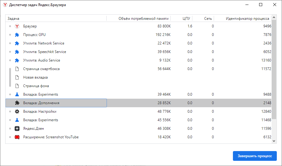 Не все знают, но в «Яндекс.Браузере» есть встроенный диспетчер задач. По аналогии с диспетчером задач в Windows он позволяет следить за тем, какие процессы и вкладки потребляют больше всего ресурсов компьютера. Используя эту информацию, вы можете легко определить, какие вкладки или, например, установленные расширения, сильнее всего нагружают ваш компьютер.