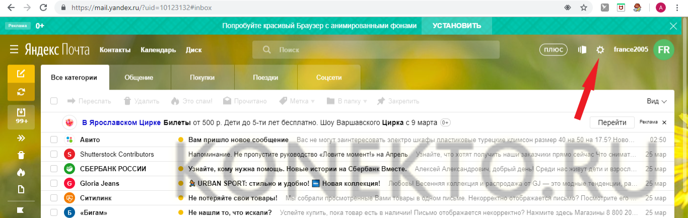 Зайдите в ваш почтовый ящик в Яндекс.Почте и кликните мышью по значку в виде шестеренки в правом верхнем углу.