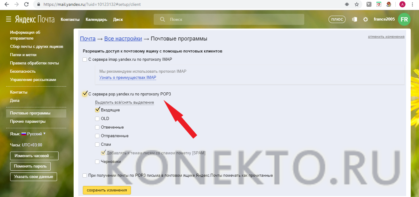 Поставьте галочку в поле, чтобы почтовые клиенты забирали почту с сервера по протоколу IMAP.
