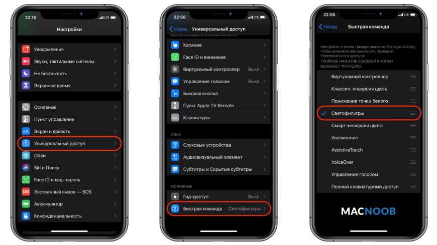 Если слева от названия функции «Светофильтры» стоит галочка, это означает, что вы можете включать чёрно-белый режим трижды щёлкнув боковую кнопку либо кнопку «Домой».