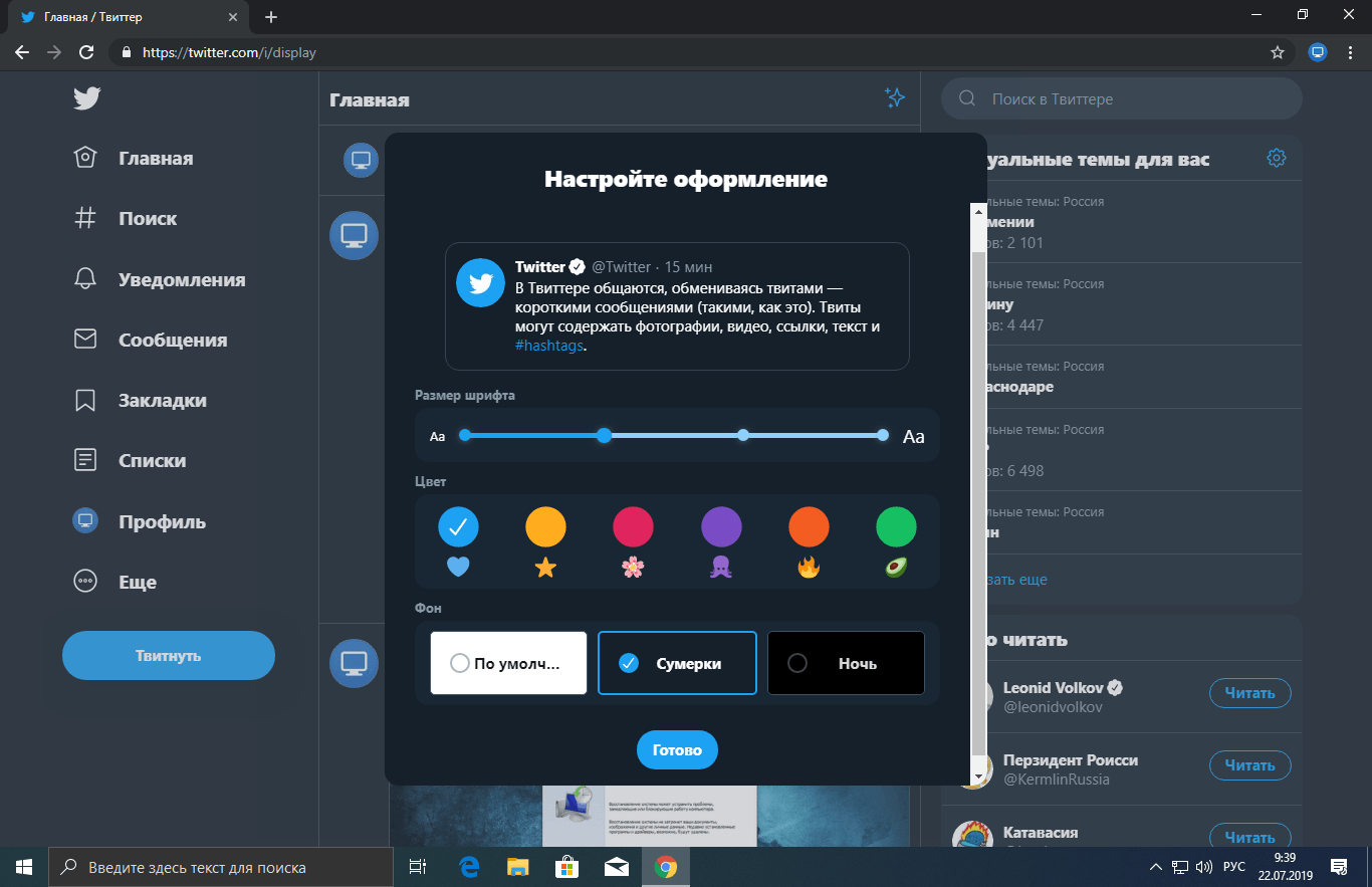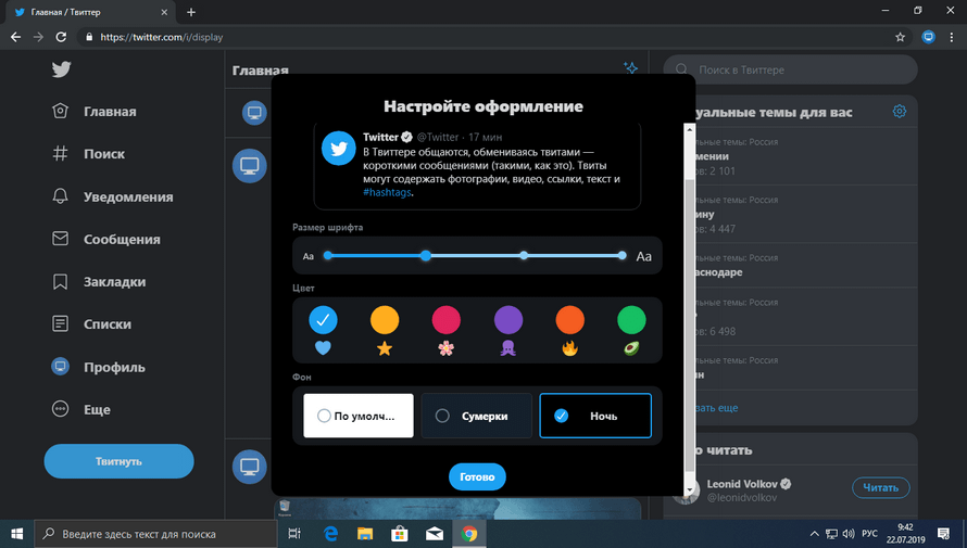 В появившемся окне выберите режим «Сумерки» или «Ночь«, настройте цвет и подходящий размер шрифта. Кликните «Готово» и Twitter перейдет от светлой темы к темной.