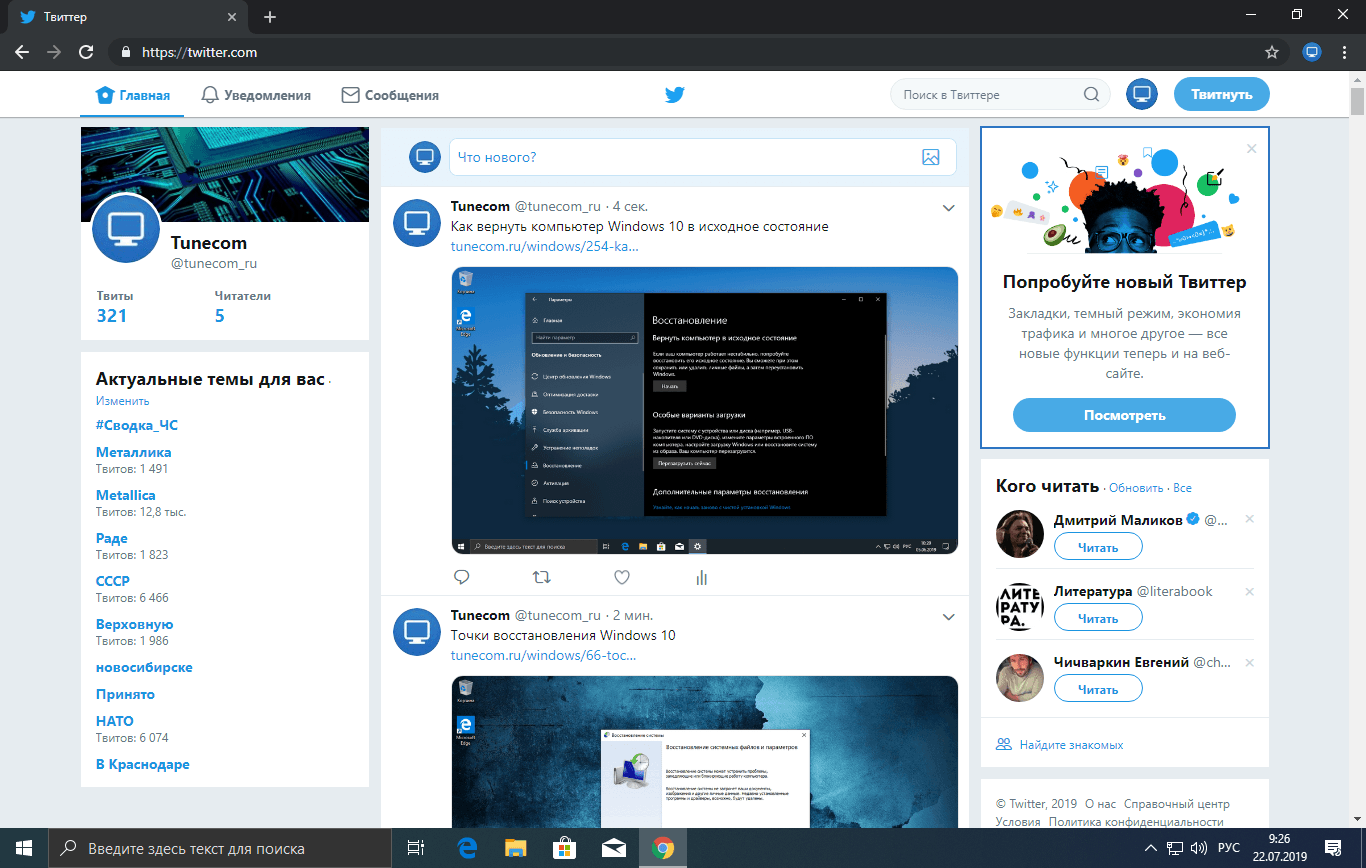 Если вы еще не перешли на новый интерфейс, откройте главную страницу Twitter и нажмите в правом верхнем блоке кнопку «Посмотреть«.