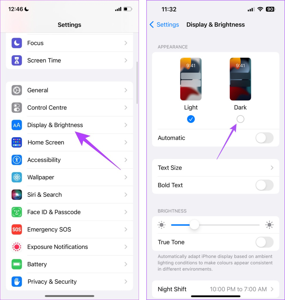 Кончик: Вы также можете включить «Автоматически», если хотите, чтобы темный режим включался вечером.