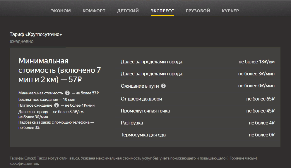 Условия тарифа «Экспресс» отличаются в зависимости от региона и типа заказа. К примеру, они могут быть следующими: