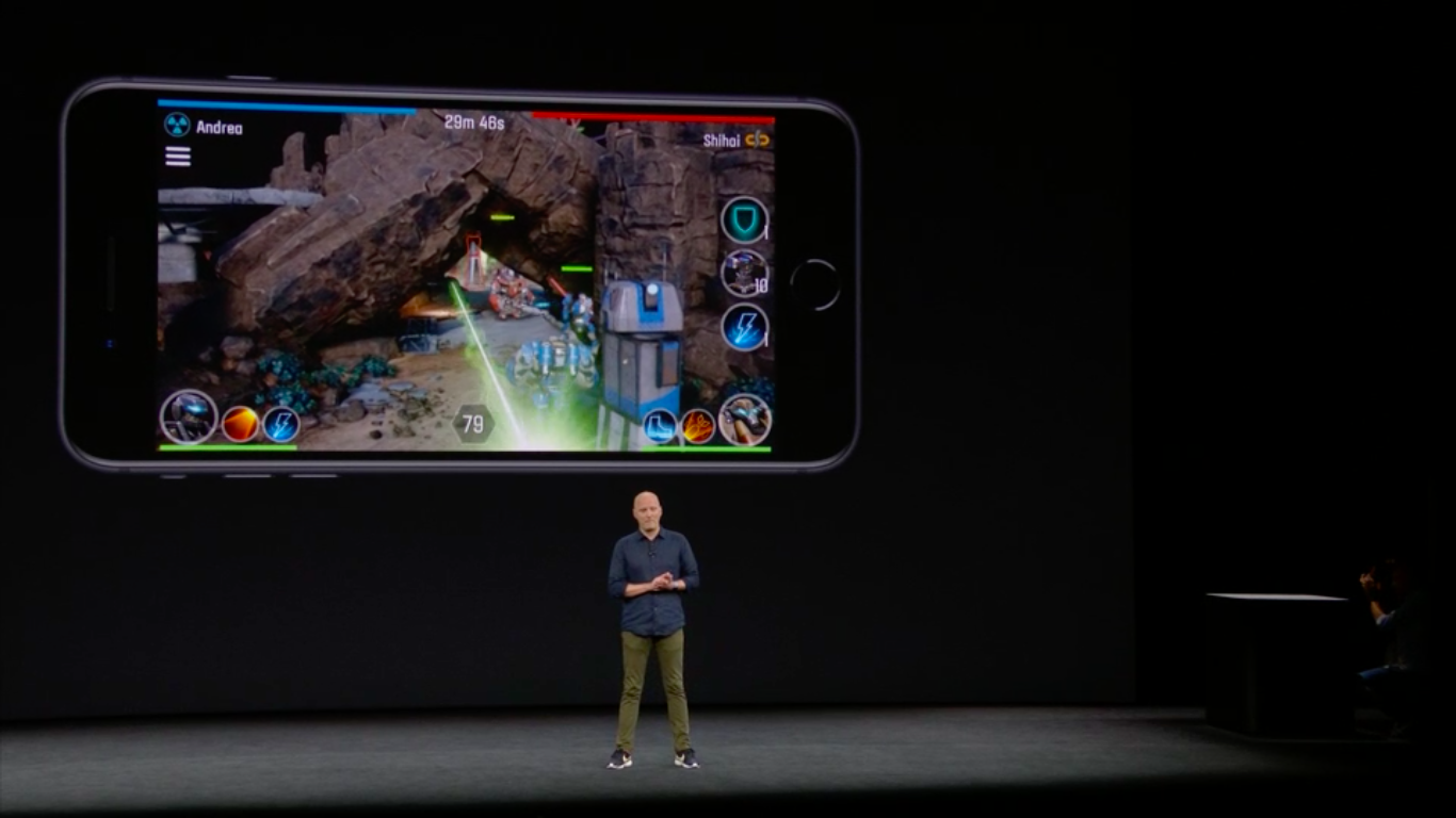 Камеры также поддерживают дополненную реальность. На презентации показали пару игрушек для AR, среди которых мне сильнее всего запомнился проект по Warhammer 40.000 про битвы между титанами. Теперь орать “За Императора!”, срывая связки, можно и в дополненной реальности. Помогает в обработке такой графики новое графическое ядро, произведённое лично Apple, и которое на 30% быстрее старого.
