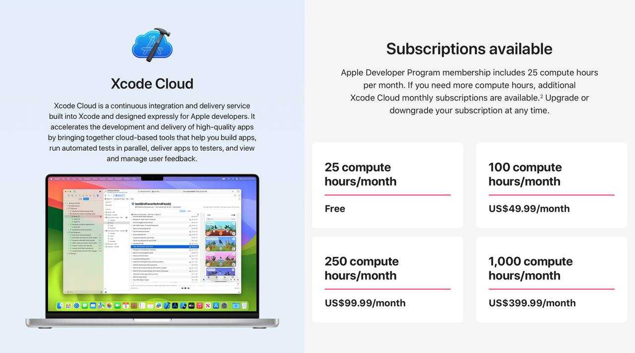 Apple добавляет 25 бесплатных часов в месяц для сервиса Xcode Cloud в базовую подписку аккаунта Apple Developer. Новшество заработает с января 2024 года.
