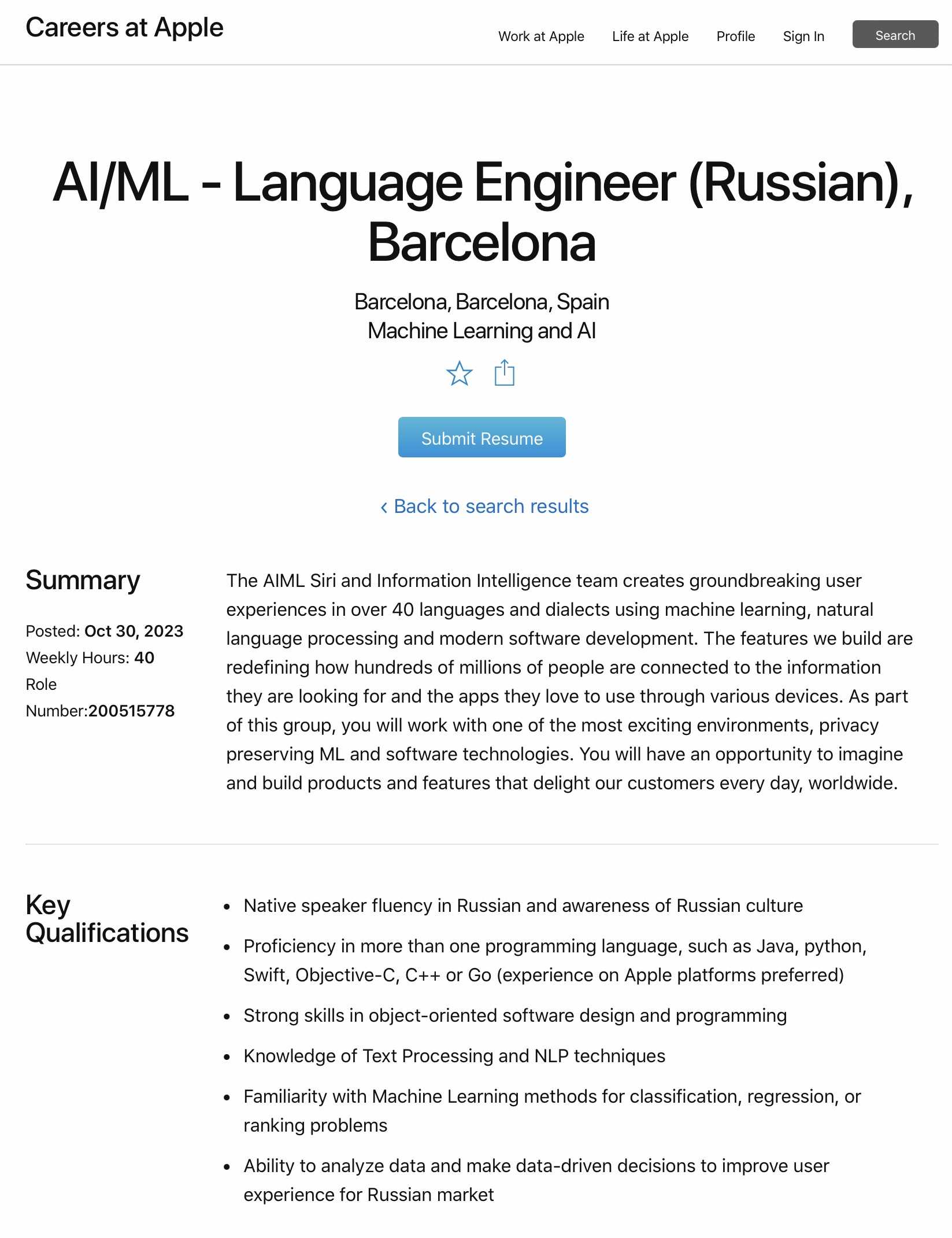 А буквально сегодня, 11 декабря, на одной из версий сайта вакансий Apple появилась довольно интересная должность – Инженер-лингвист со знанием русского языка для работы над AI и ML