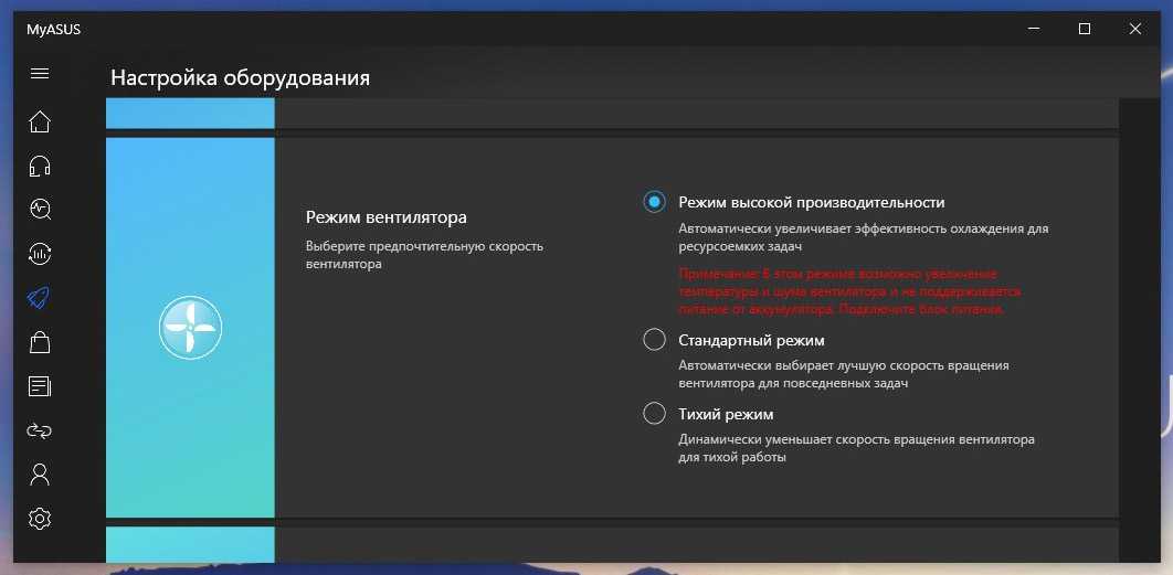 Классически приложение MyAsus на ZenBook имеет три преднастроенных режима работы ноутбука: полная производительность с работой системы охлаждения на полной мощности, стандартный режим с ограничением оборотов и шума, тихий режим, обеспечивающий минимальный шум и, соответственно, самую малую производительность.