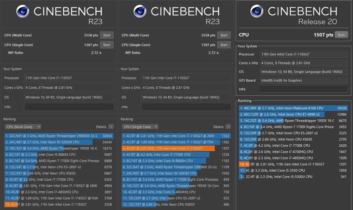 В синтетике CINEBENCH R23 Intel Core i7-1165G7 показал сниженный балл относительно табличных показателей самого же себя. Скорее всего, здесь ограничителем выступает высокий нагрев из-за узкого корпуса, в результате чего частота сбрасывается. В многоядерном режиме результаты близки к ожидаемым и в целом неплохие.