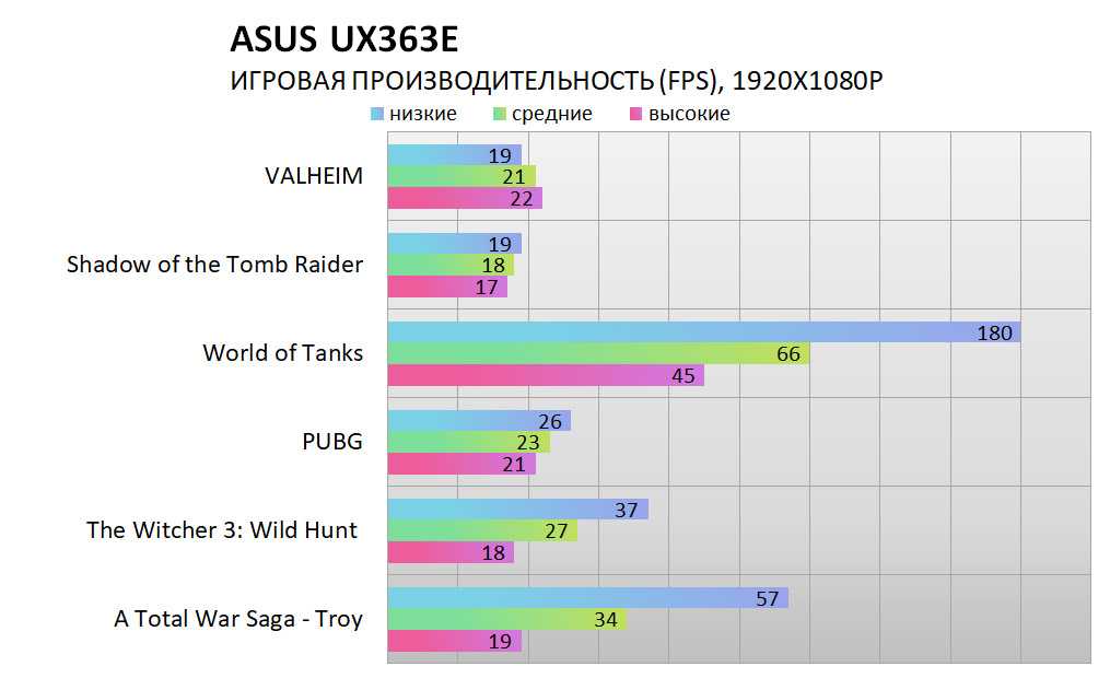 Оценили мы и игровую производительность модели. Полученные FPS нам показались чуть ниже ожидаемых, скорее всего всё по той же причине – при предельных нагрузках на чип и на видеоядро одновременно система быстро ограничивает TDP, что приводит к сбросу частот. Несмотря на это, ноутбук в разрешении FHD более-менее справляется с Ведьмаком 3 на низких настройках, а также должен обеспечить относительно комфортную игру в стратегиях серии TOTAL WAR, не говоря уже о популярной сессионке World Of Tanks. Поколдовав с настройками, возможно, удастся поиграть даже в PUBG и популярную инди-новинку VALHEIM (игра пока в раннем доступе, так что не слишком оптимизирована).