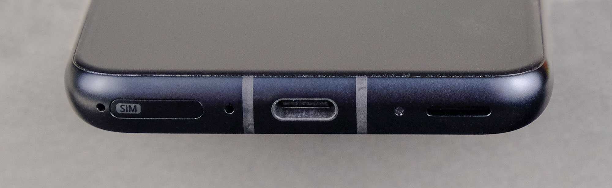 Лоток для сим-карт неожиданно нашёлся на нижнем торце, отверстие для его извлечения находится слева. Интерфейс зарядки у модели – USB Type-C. Справа от него расположен также светодиод, сигнализирующий об уведомлениях и состоянии батареи при зарядке.
